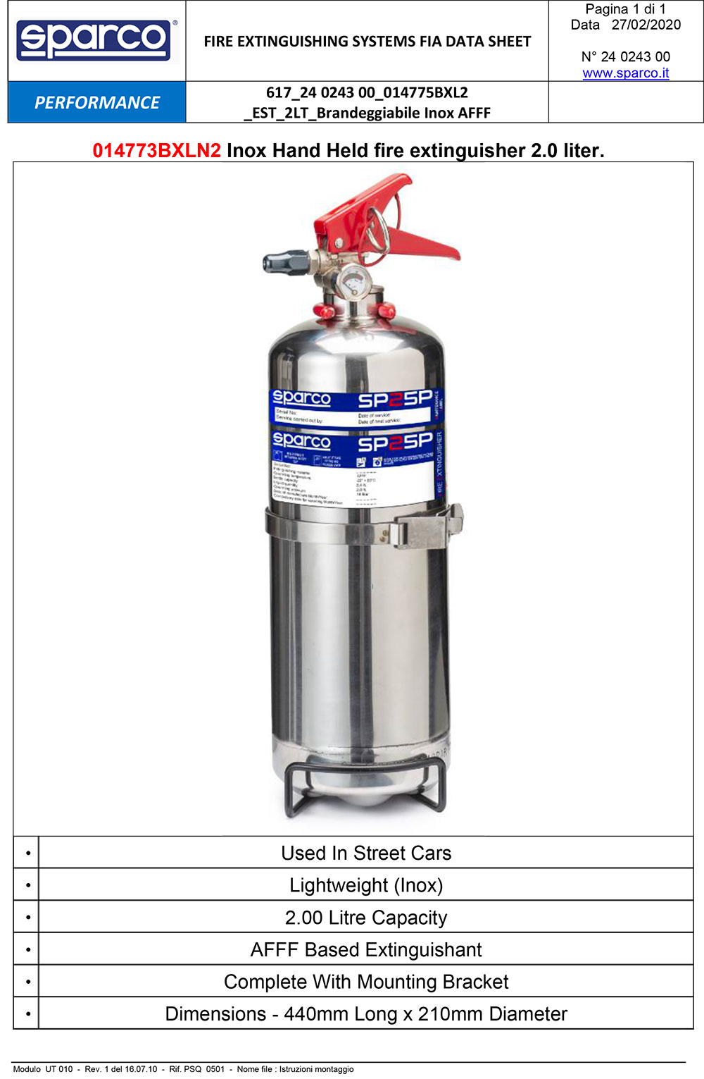 Spécifications de l'Extincteur à Mousse Sparco 2.0L (FIA)