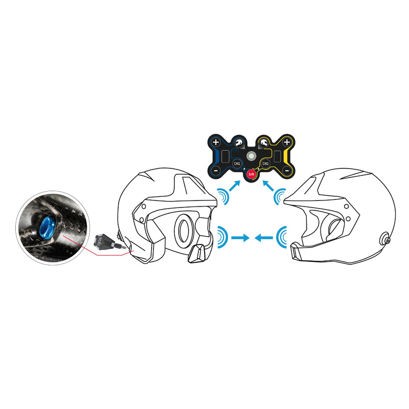 La clé du casque est branchée sur le port latéral et couplée à l'intercom, permettant à la connexion de fonctionner jusqu'à une distance de 10 mètres. Cela permet à l'équipage de sortir de la voiture avec le casque et de continuer à se parler. Alimenté par l'alimentation 12 volts de la voiture, le plus grand changement dans cet intercom est la fonctionnalité sans fil vous permettant de retirer les câbles de connexion des casques de l'équipage.