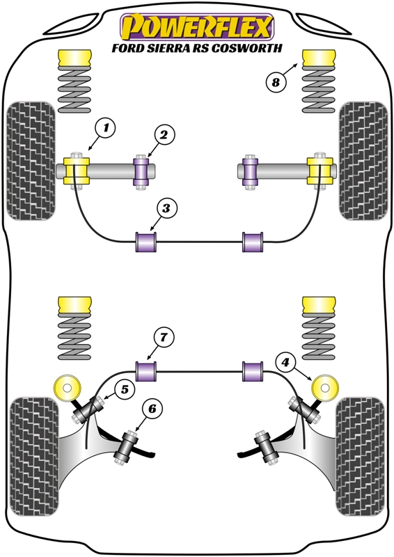 Spécifications des Silentblocs Powerflex pour Ford Sierra RS Cosworth, dont RS500 (86-88)